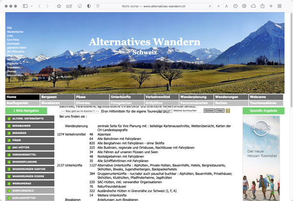 Eine riesige Datenbank von Hütten, die man in der Schweiz erwandern kann. Wenn man selber seine Alphütte zur Verfügung stellen will, kann man sie auf der Internetseite anmelden. Mit Informationen zu Unterkünften, Verkehrsmittel, Biwaks, Passübergänge und vielem mehr.