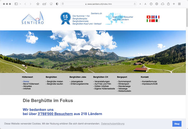 Nicht alle, die am Berg arbeiten wollen, müssen auf die Alp. Es gibt auch noch SAC- und Berghütten. Sentiero ist das Job-Portal dazu. Auf der Website findet man zudem Berg- und Alphütten zum Mieten, einen Veranstaltungskalender und massenhaft Links zu Velowegen, Wanderwegen, Wetterdiensten usw.