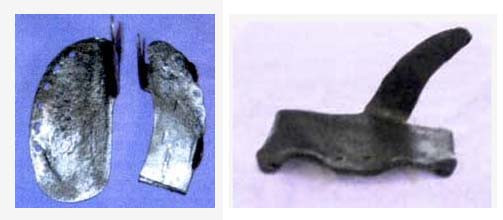 Auf dem Bild links sehen wir auf der äusseren Seite die Nagellöcher, in der Regel 4 - 6 Stück. Da auf der Klaueninnenseite nicht genagelt werden kann, befindet sich an der Innenseite des Eisens die sogenannte Feder, welche über die Zehenwand gezogen wird. Dadurch erhält das Eisen einen guten Halt. Angepasst werden die Eisen kalt. Auf dem rechten Bild sehen wir ein Eisen mit Kappen und Griffen. Solche wurden vorwiegend im Winter angebracht.