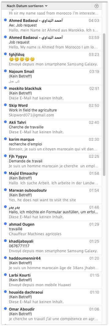 Männer und Frauen aus Marokko, die arbeiten wollen, die verdienen wollen, die ein besseres Leben wollen, eines mit Perspektive. Sie schalten auf der Stellenbörse 40 Inserate pro Tag in arabisch, französisch, englisch und googletranslatordeutsch. Sie setzen im zalpletter unablässig Kommentare ab, sie schicken uns Lebensläufe, sie mailen, sie whatsappen, sie überschwemmen die Stellenbörse, die so kaum mehr lesbar ist.