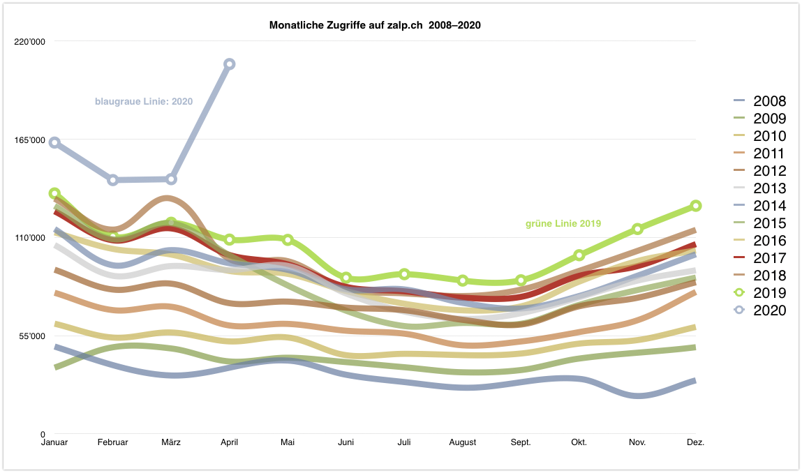 Im April und Mai 2020 artet der Zugriff auf zalp.ch vollends aus. Im Mai 2020 klicken sich 216’965 BenutzerInnen ein, das sind über 7000 pro Tag. Zum vergleich: Im Mai 2019 waren es 108’640 Einwahlen.