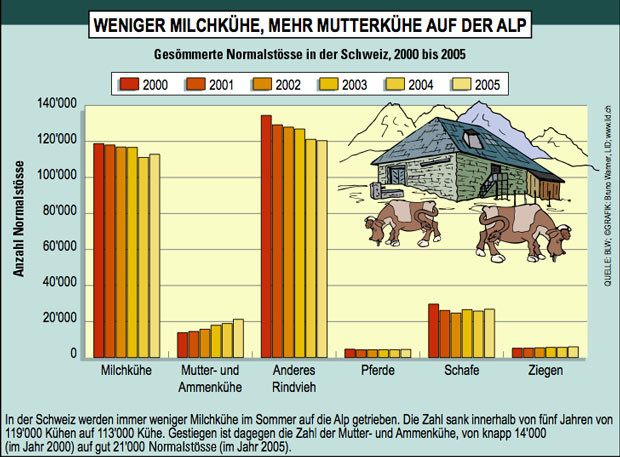 Der Gebirgskanton Graubünden hat dreieinhalb Mal so viel Alpweiden wie landwirtschaftliche Nutzfläche; jeder fünfte Quadratmeter Boden liegt im Sömmerungsgebiet. Die Alpweiden vergrössern die Futterbasis der ortsansässigen Bauern um mindestens 20 Prozent. Entsprechend hoch ist der Stellenwert der Alpwirtschaft: Nur 7 Prozent des einheimischen Viehs bleibt im Sommer zuhause; während 13 Prozent der gealpten Tiere aus anderen Kantonen stammen. In den letzten Jahren hat sich die Zusammensetzung der Alptiere stark verändert: Allein zwischen 2001 und 2005 ist der Anteil des Jungvieh deutlich zurückgegangen; auch bei den Milchkühen gab es ein leichtes Minus. Weil jedoch die Mutterkühe auf den Alpen im selben Zeitraum um 42 Prozent zugelegt haben, wurde dieser Rückgang zum grössten Teil kompensiert.